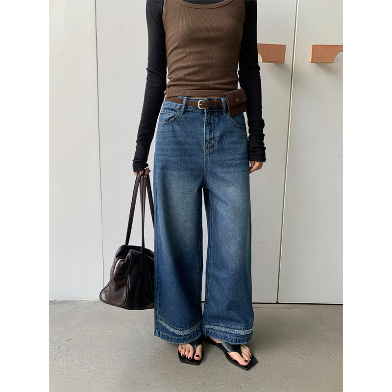 LDOO SHOP 日单 植物染色日本水洗下摆不规则裤脚边阔腿牛仔长裤