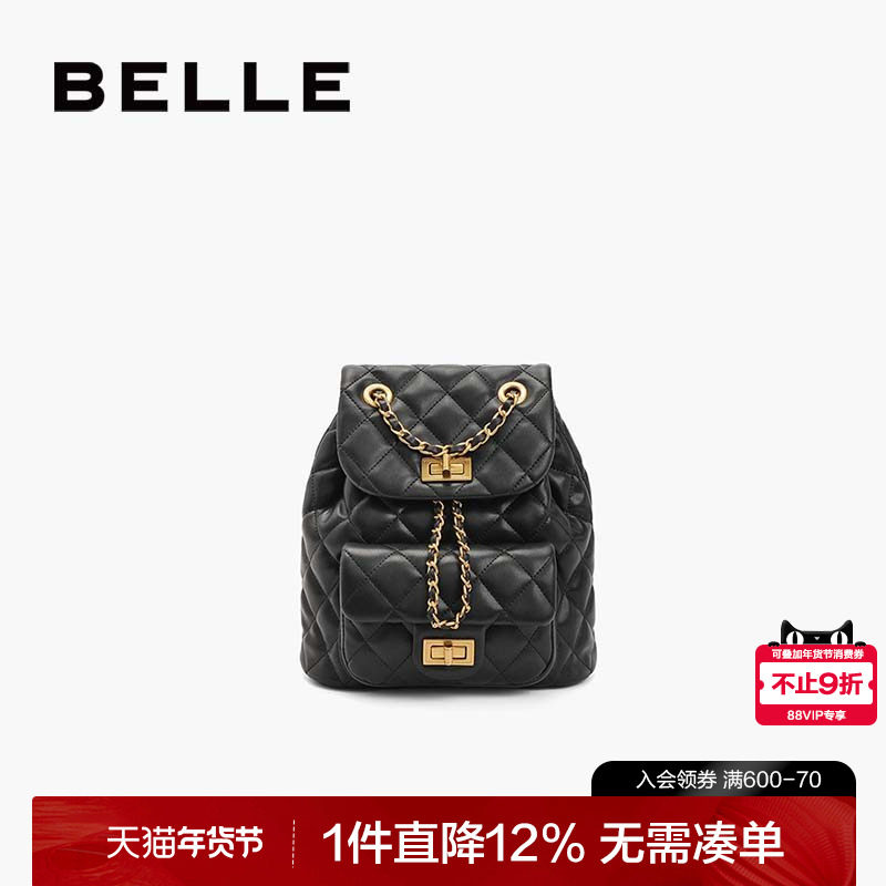 百丽包包女款经典小香风背包通勤黑色质感轻便链条双肩包X7046CX4