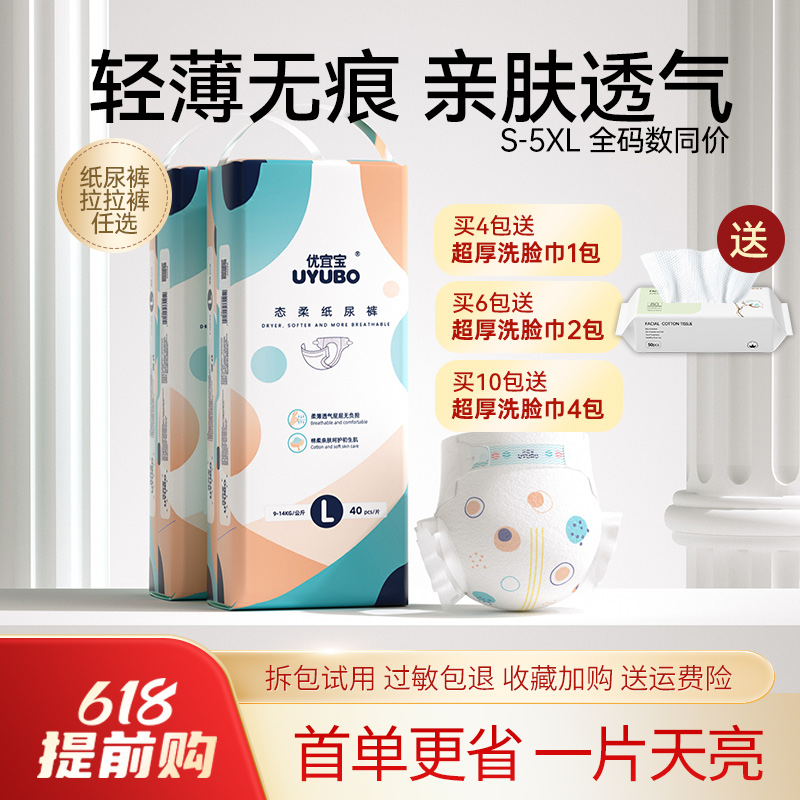 优宜宝胖宝宝纸尿裤L超大码5XL婴儿尿不湿超柔超薄透气干爽拉拉裤