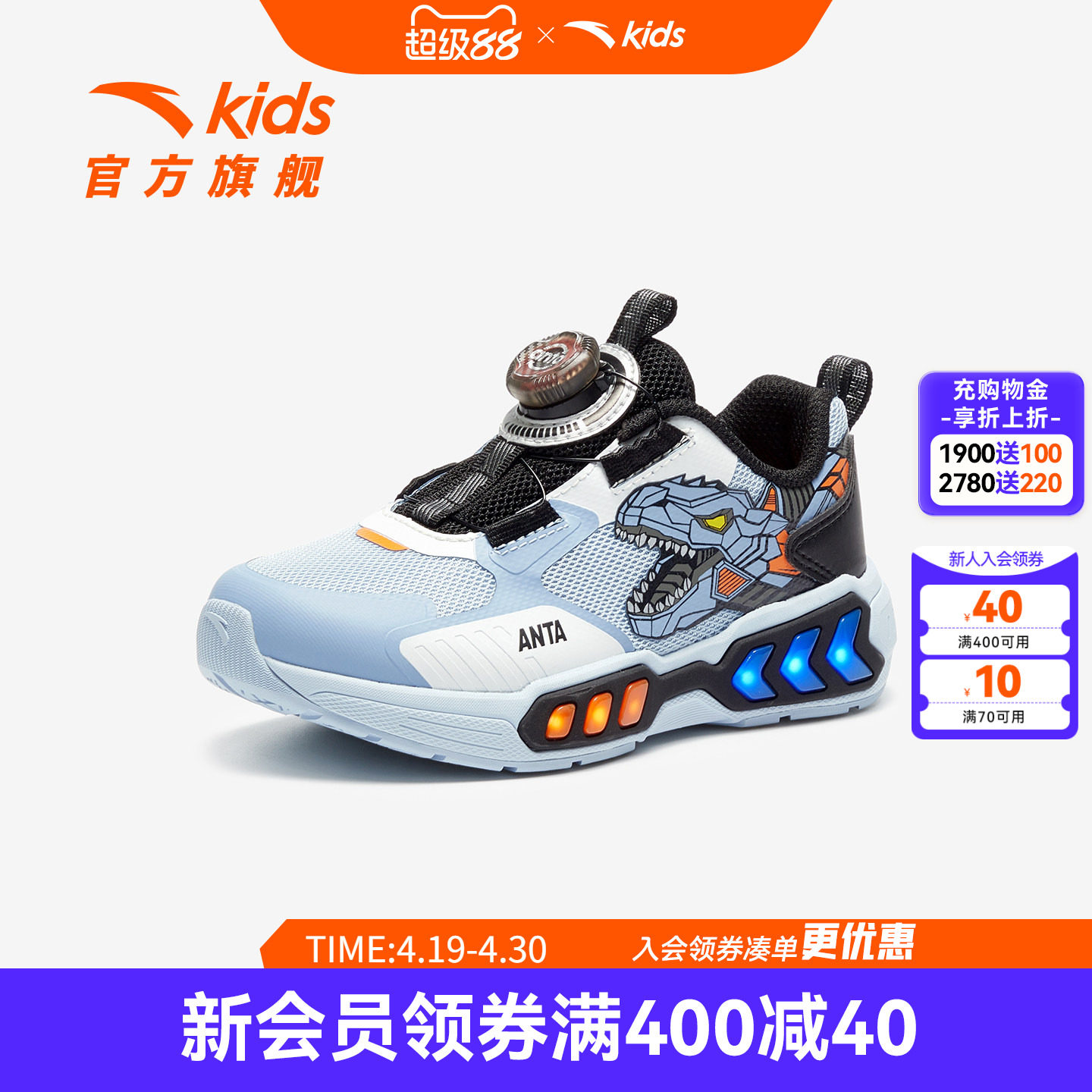 安踏童鞋恐龙闪灯鞋儿童男小童休闲鞋2026夏季新款网面透气运动鞋