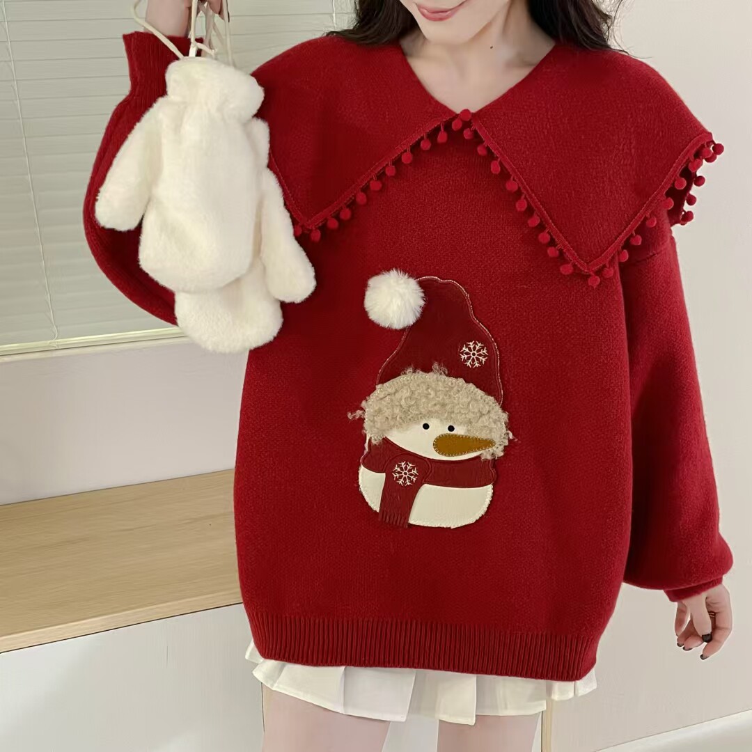 新年红色卡通娃娃领套头毛衣女春秋新款宽松洋气针织气质减龄上衣
