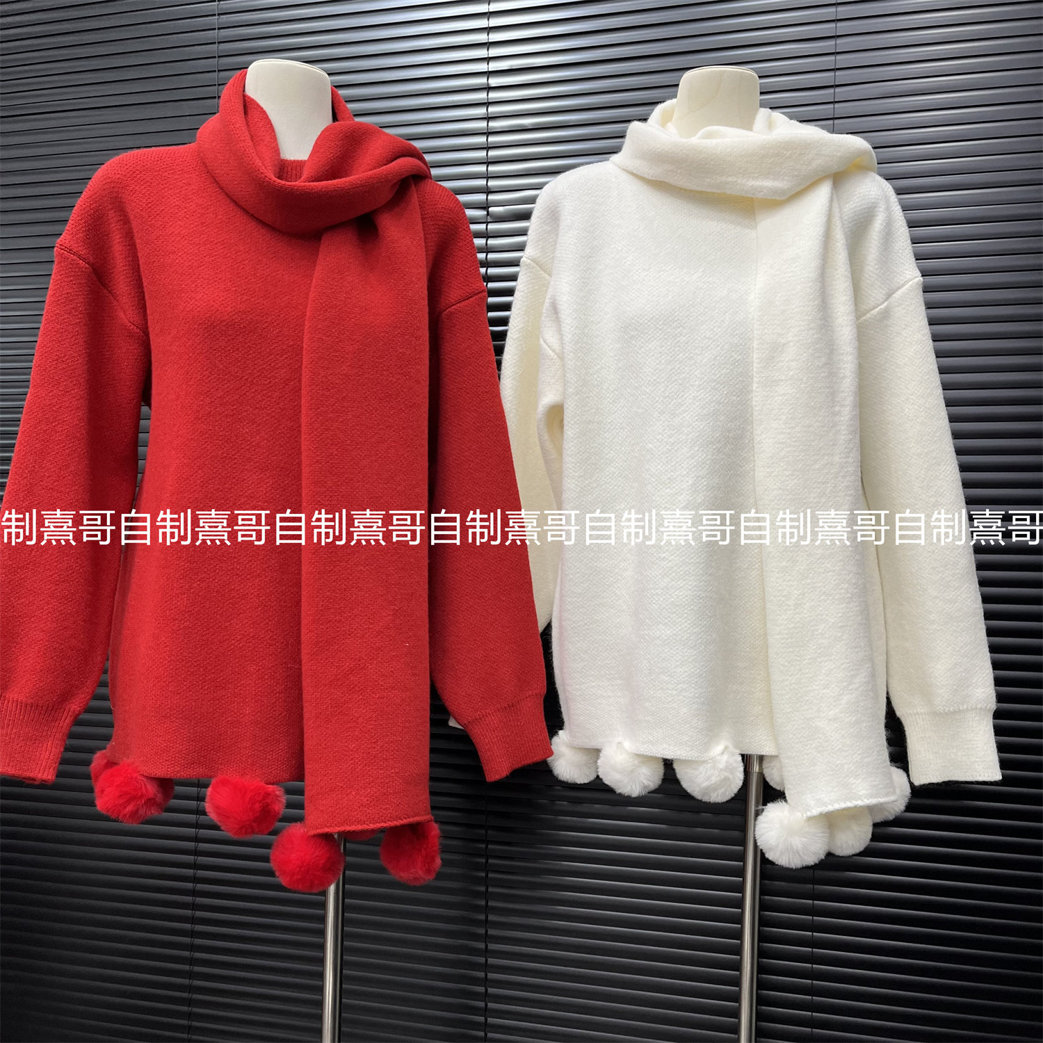 慵懒风时尚显瘦百搭长袖套头毛衣女春季洋气减龄毛球球围脖两件套
