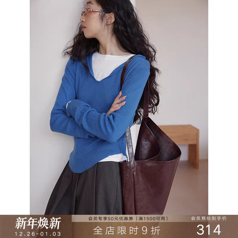 popchrio◆可机洗羊毛v领连帽弧摆针织衫设计感小众套头毛衣女春