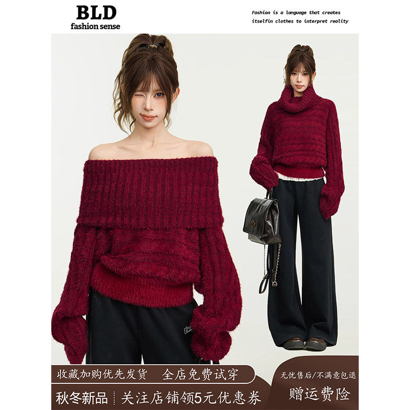 新年本命年红色一字肩露肩套头毛衣女春秋季加厚内搭高级感针织衫