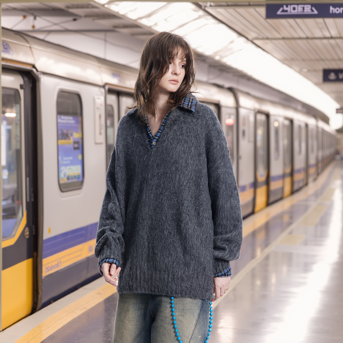 EAM STUDIO高级设计感立体网纱拼接大廓形羊毛V领套头毛衣女春秋