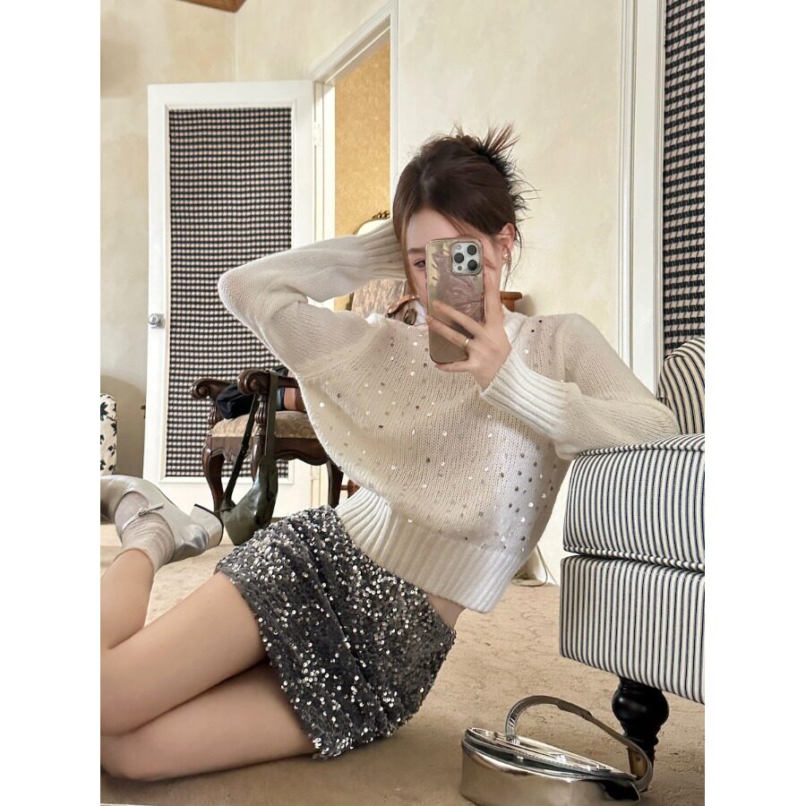 设计感重工亮片套头毛衣女春秋新款内搭半高领打底针织衫短款上衣