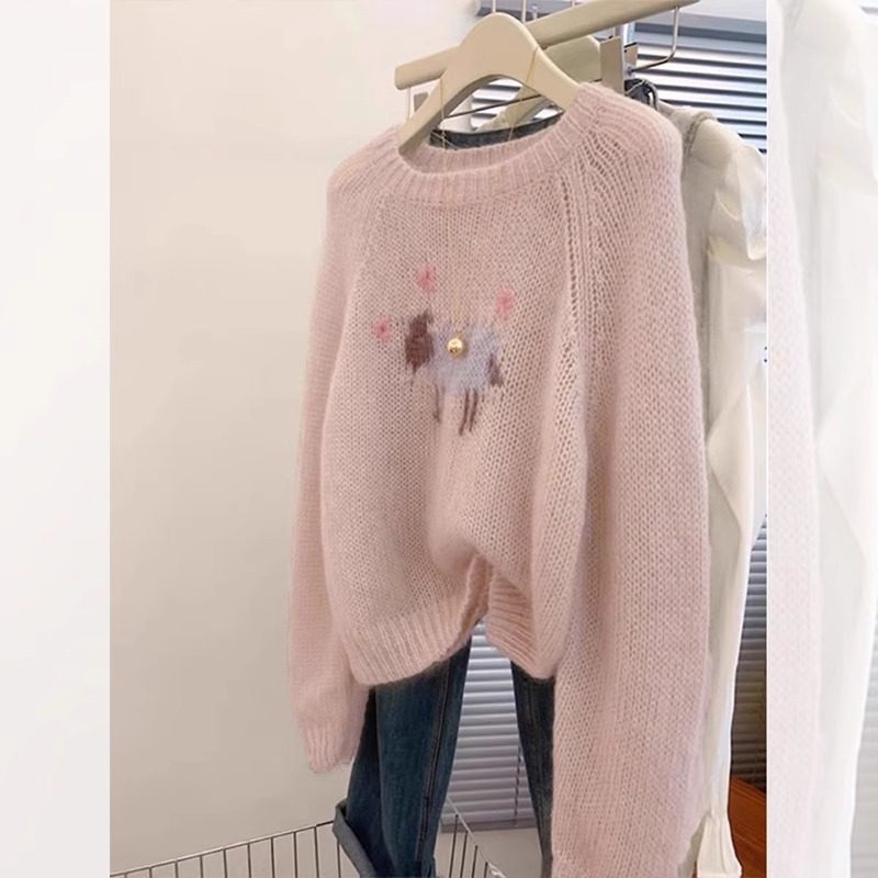 粉色温柔风小羊提花针织套头毛衣女春季2025新款内搭软糯打底上衣