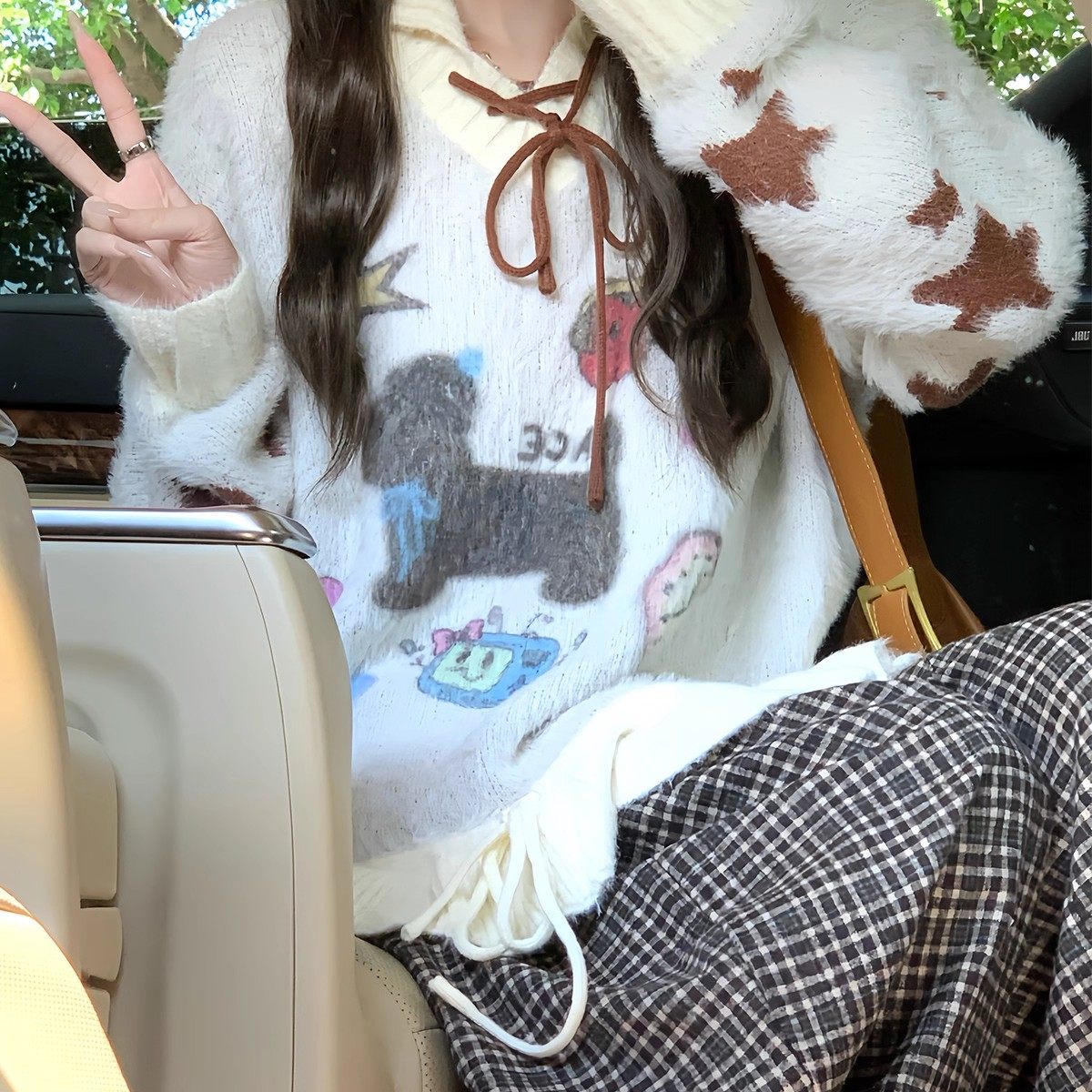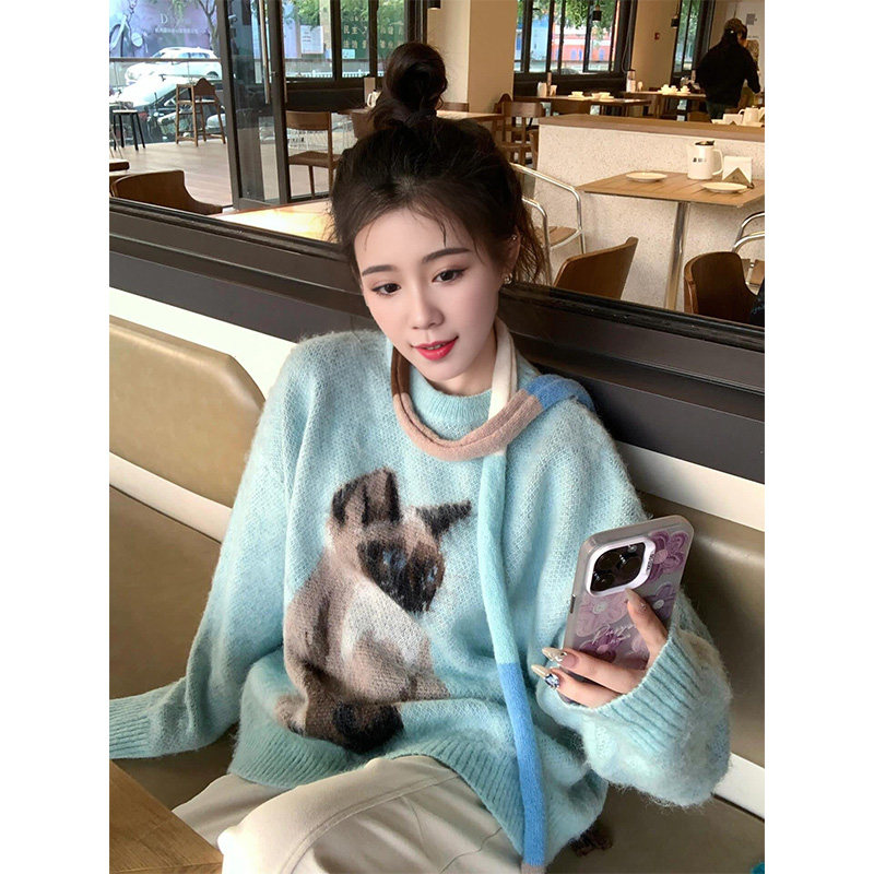 慵懒风软糯猫咪套头毛衣女春秋季宽松独特超好看可爱外套上衣围巾