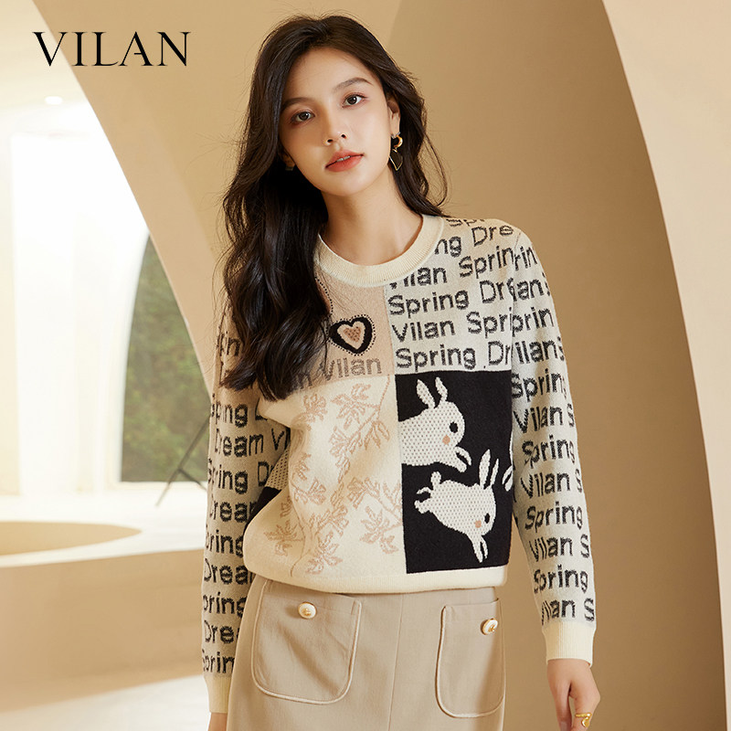 vilan/慧兰商场款圆领套头毛衣女春内搭小个子复古兔子打底针织衫
