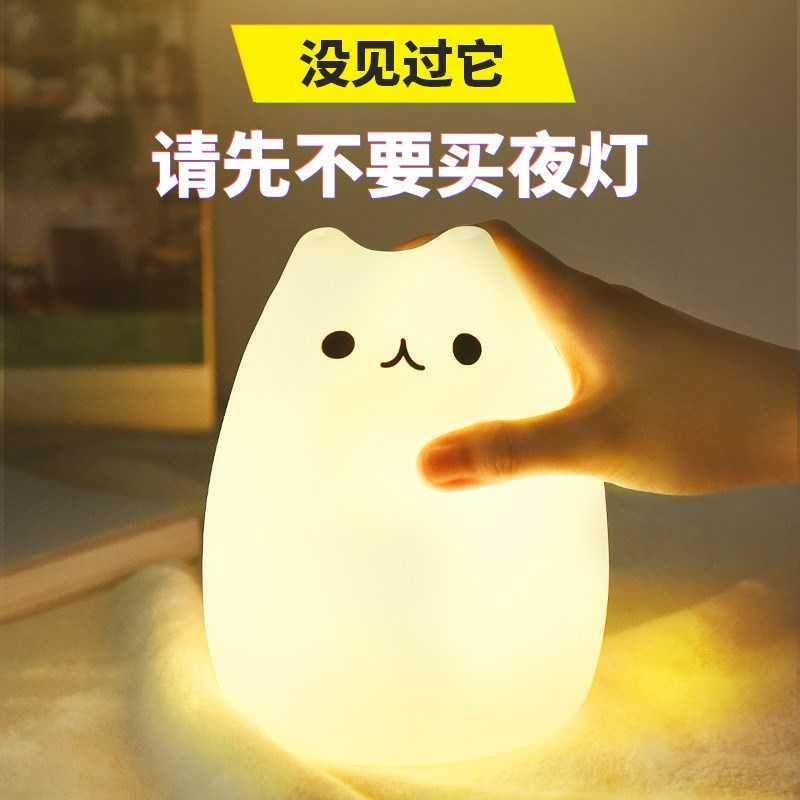 小猫七彩萌猫硅胶动物小夜灯充电式床头台灯拍拍插电创意梦幻可爱