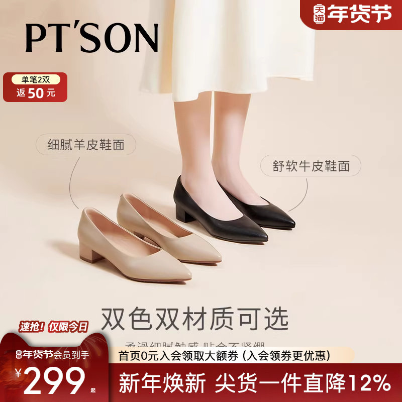 星期六真皮羊皮尖头中跟单鞋2025新款深口粗跟女款皮鞋女鞋子直