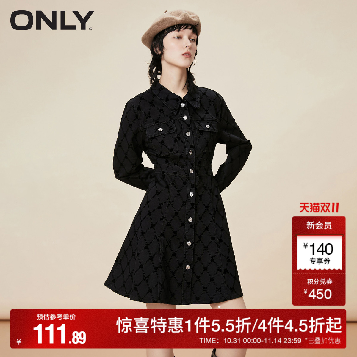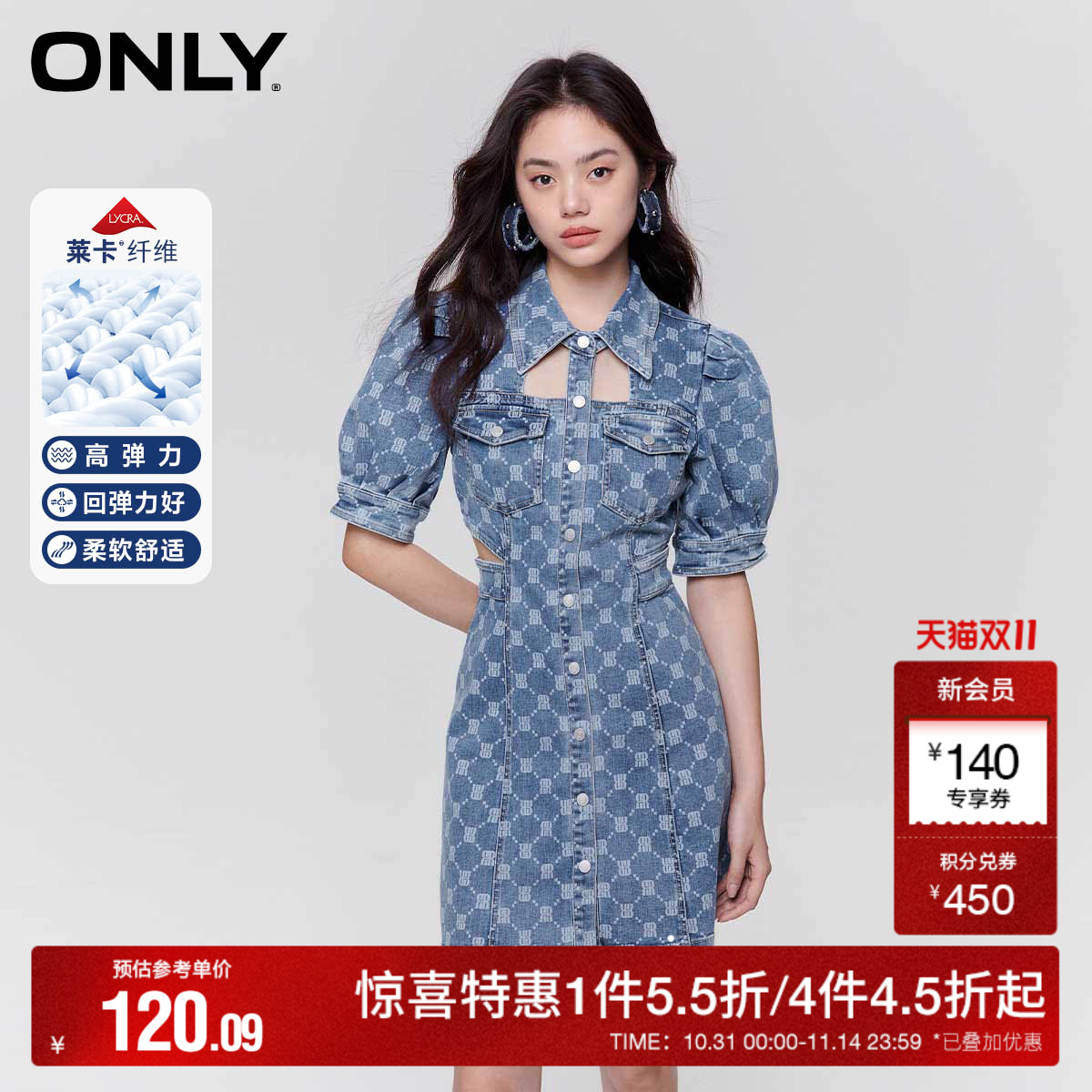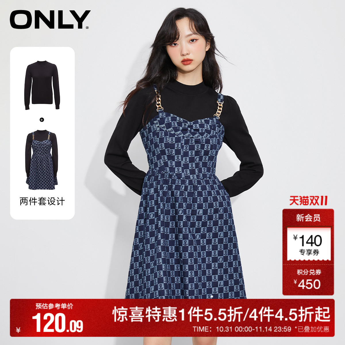ONLY奥莱2025秋冬新款修身针织拼接牛仔裙圆领高腰七分袖连衣裙女