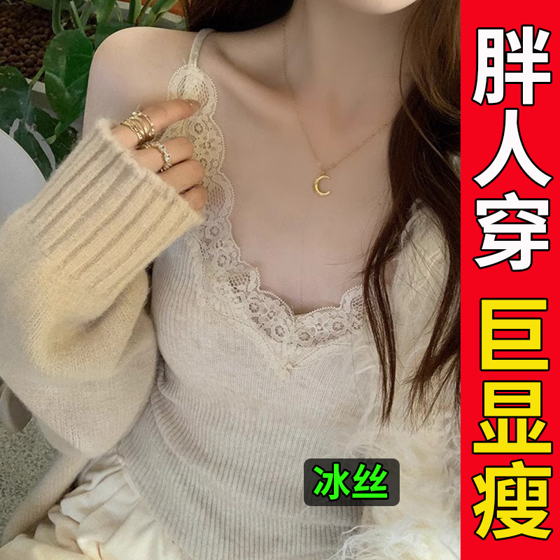 大码胖mm法式鱼骨蕾丝吊带背心女针织冰丝设计感小众外穿内搭上衣