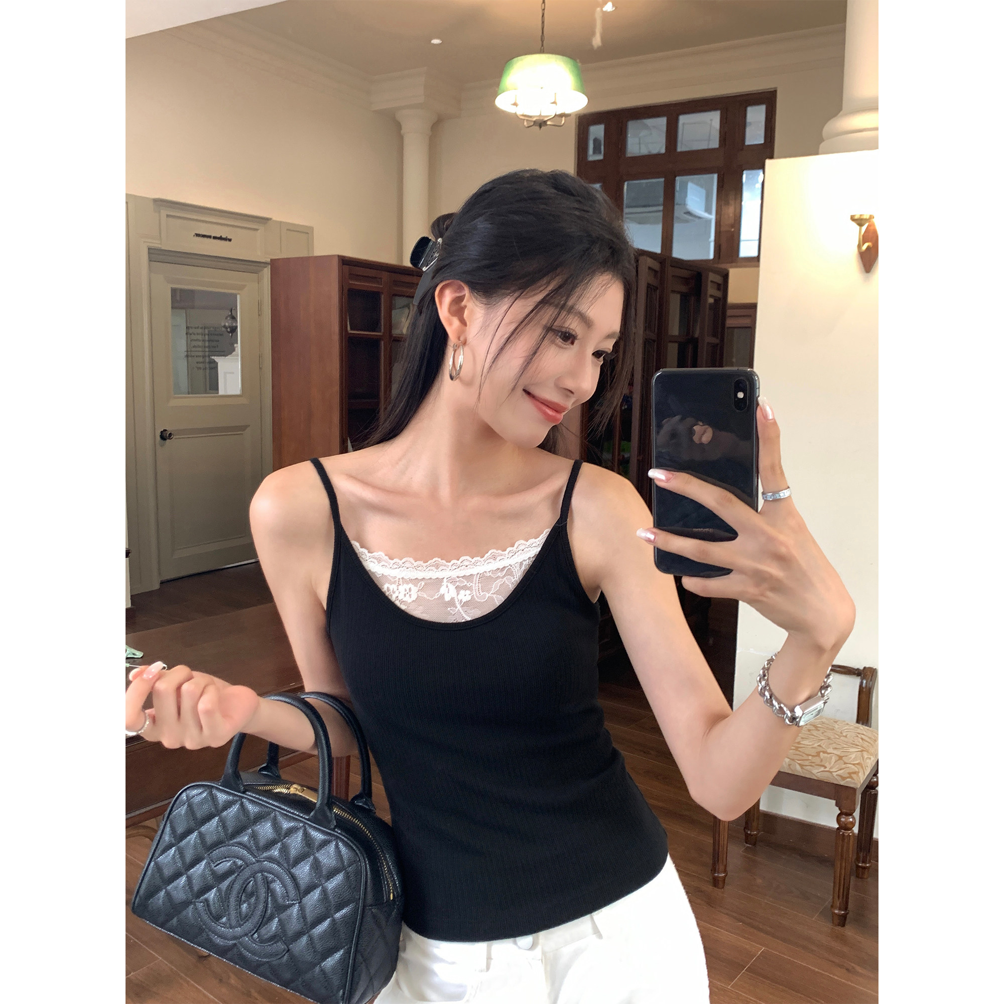 pusumede 【现货7.5折】纯欲蕾丝花边吊带背心女针织无袖上衣