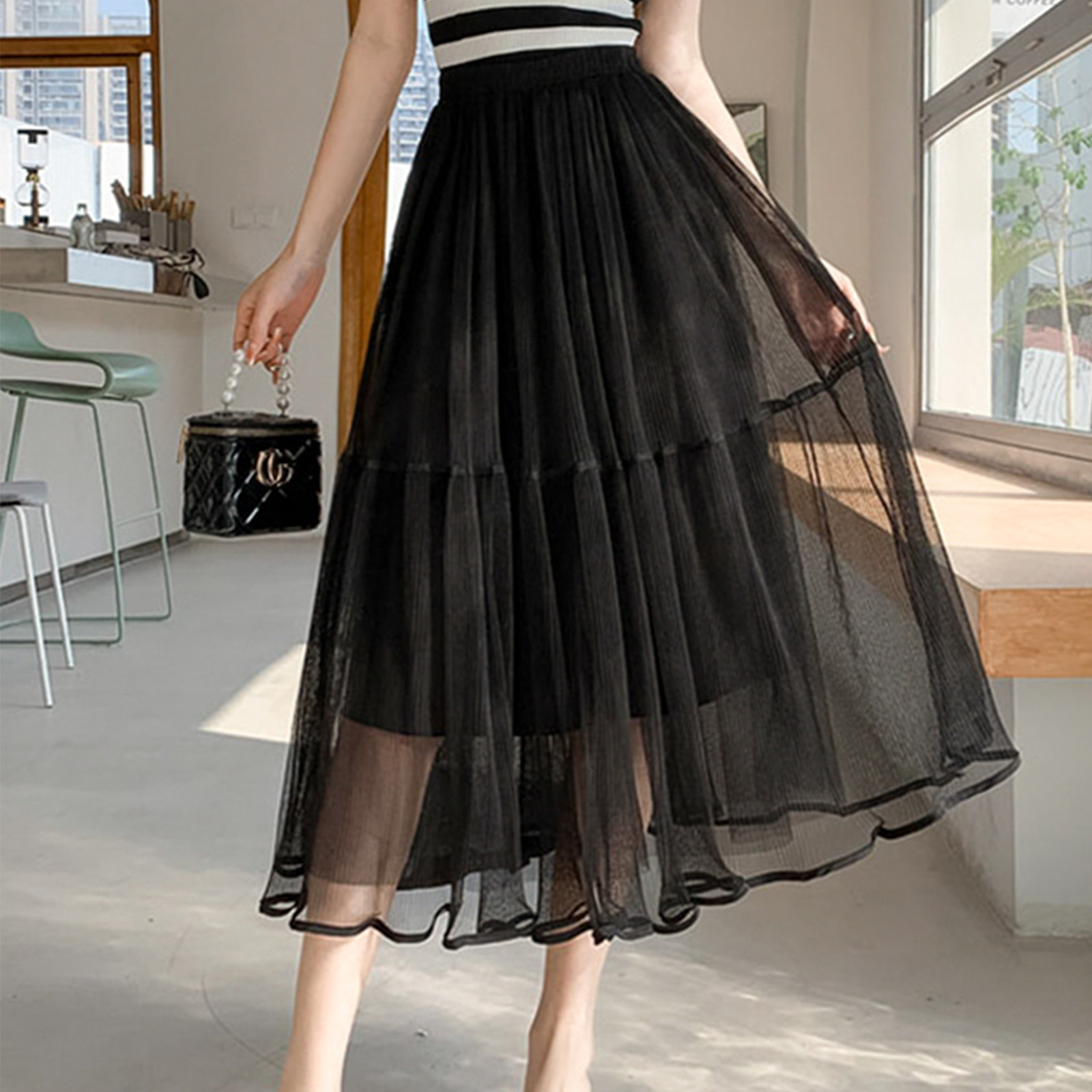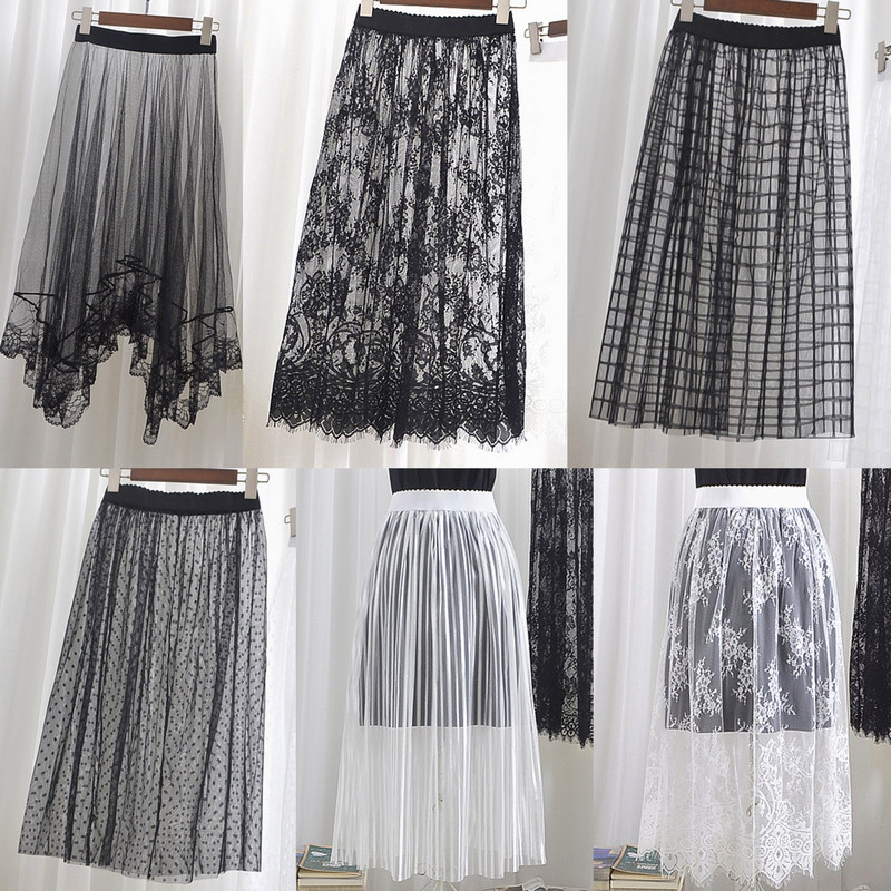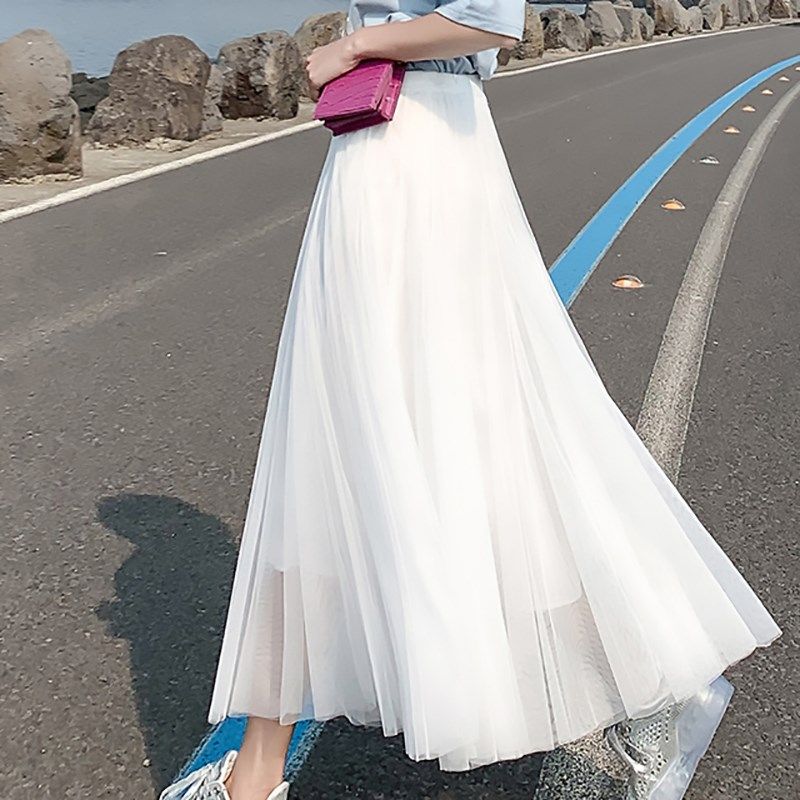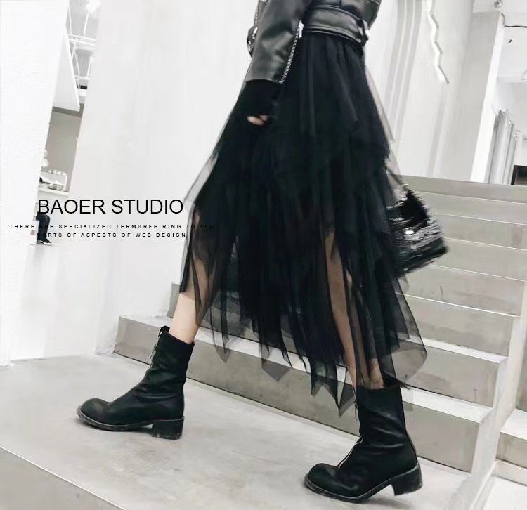 不规则网纱半身裙中长款百褶裙长裙夏季新款百搭高腰A字透视纱裙