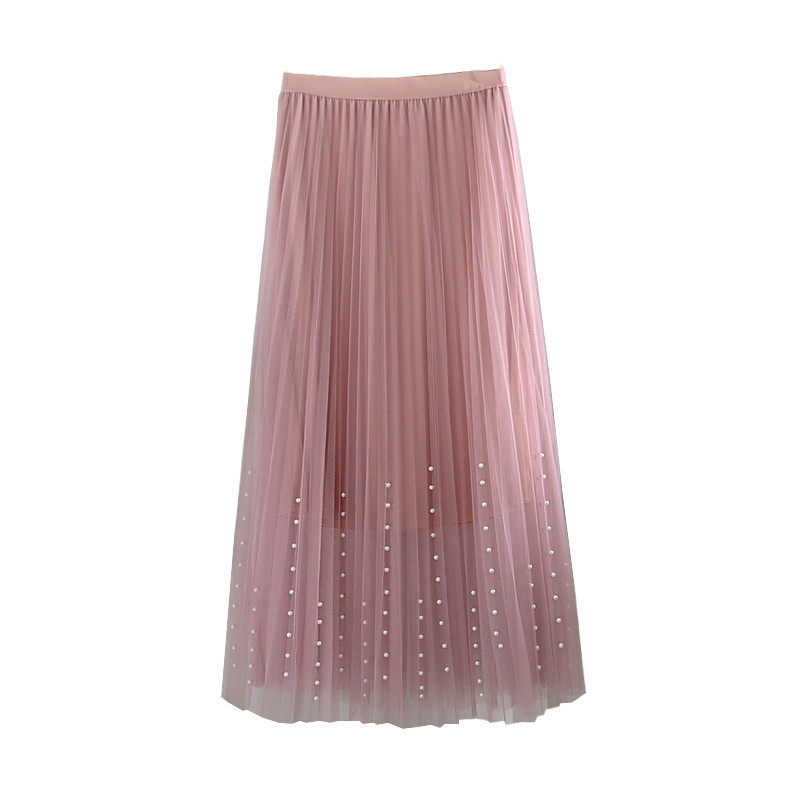 流光纱裙女2023秋季牛奶珠光裙子气质杨柳皱网纱半身裙中长款