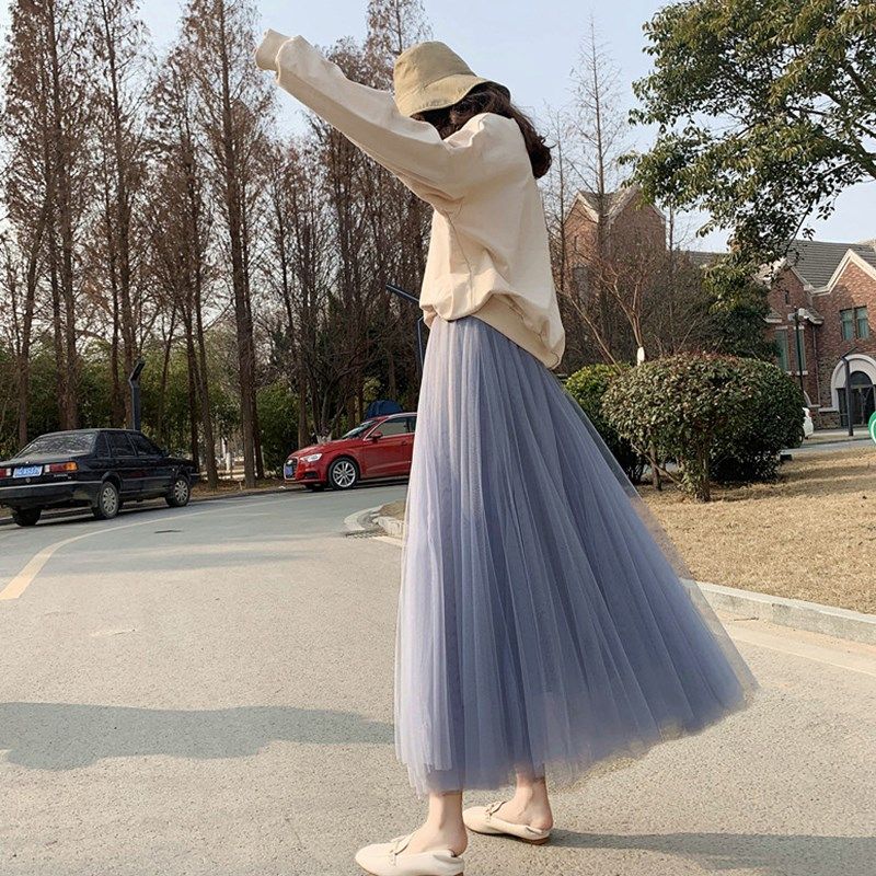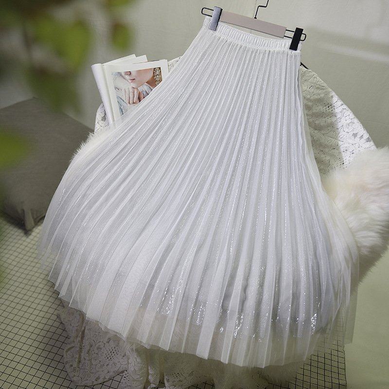 秋冬新款网纱半身裙高腰显瘦裙大摆A字裙纱裙中长款百褶裙甜美仙