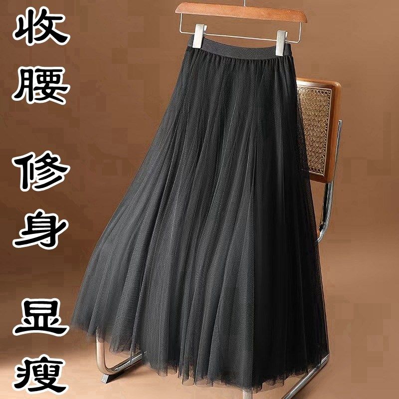 2025新款时尚百搭高腰网纱半身裙中长款纱裙大码女a字蛋糕百褶裙