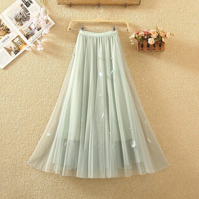 春夏新款高腰a字大摆钉珠羽毛网纱半身裙中长款裙子蓬蓬裙纱裙女