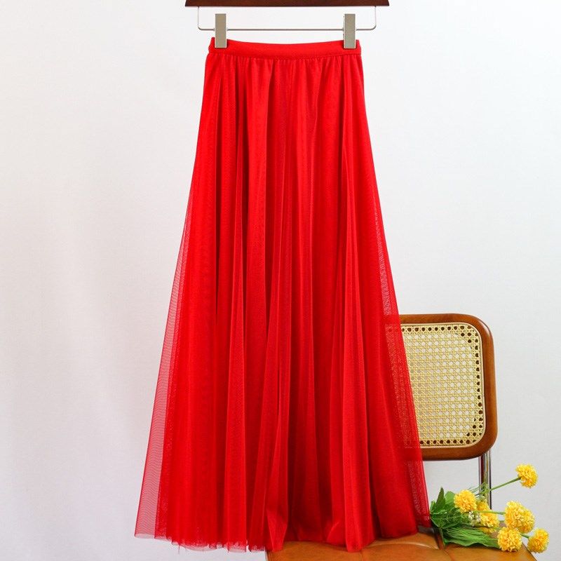 网纱半身裙中长款黑色高腰720度大摆红色百褶垂感纱裙显瘦长裙子