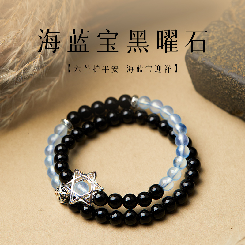 黑曜石手串海蓝宝六芒星多圈天然水晶双层长手链五行补缺水男女款