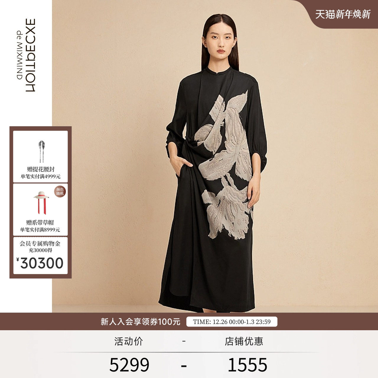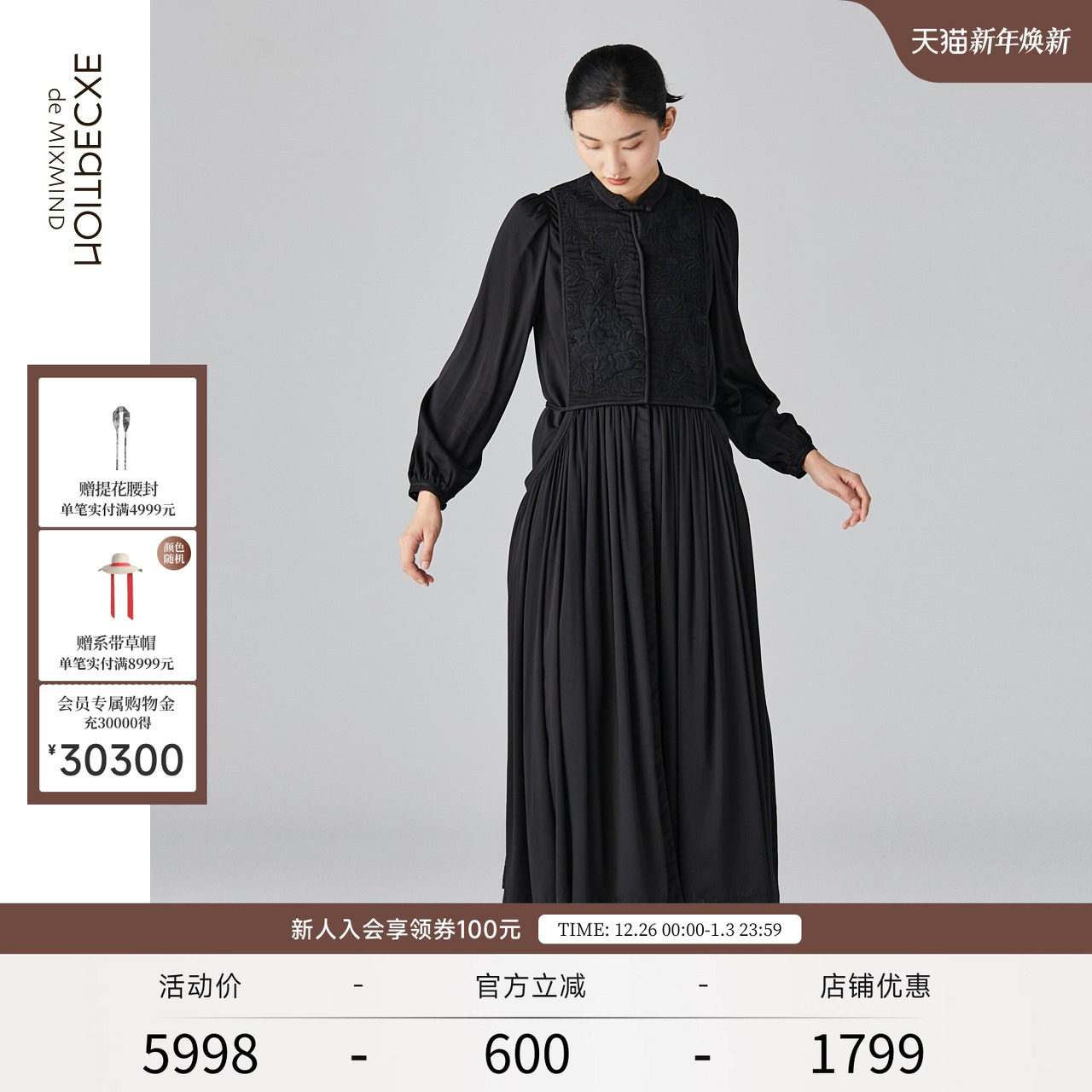 EXCEPTION例外女装春秋款连衣裙绣花小立领新中式盘扣裙子中长裙
