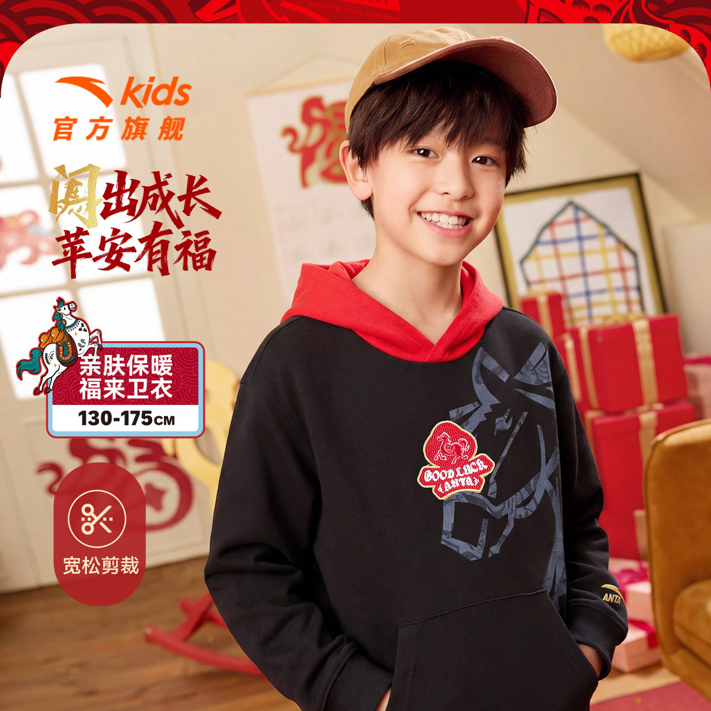 【红色新年马年】安踏儿童卫衣男童连帽套头衫2026年新款拜年衣服