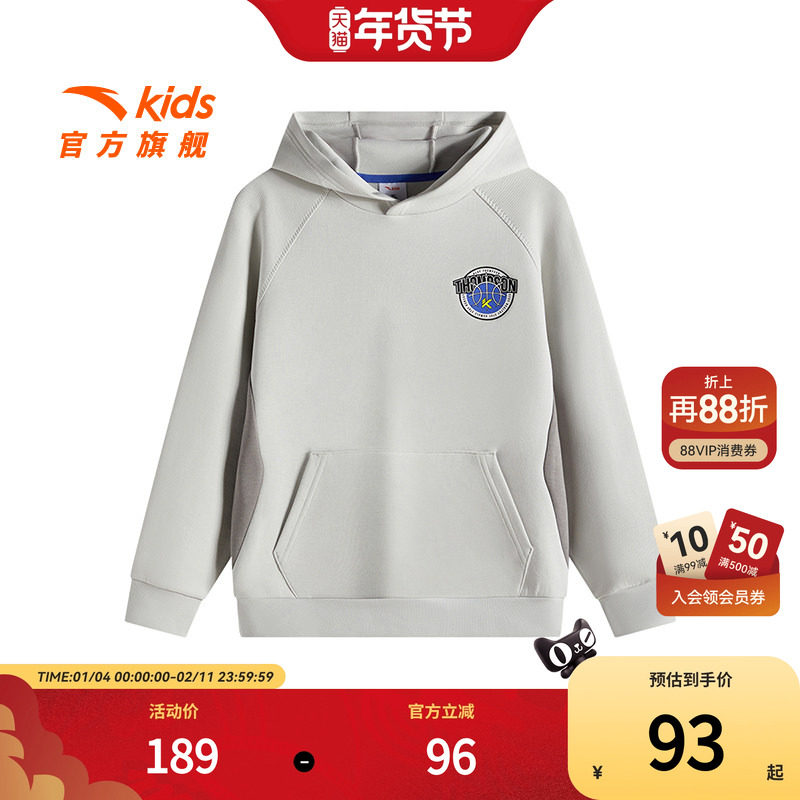 安踏儿童男大童连帽卫衣篮球套头衫2025春新款中大童运动抗菌卫衣