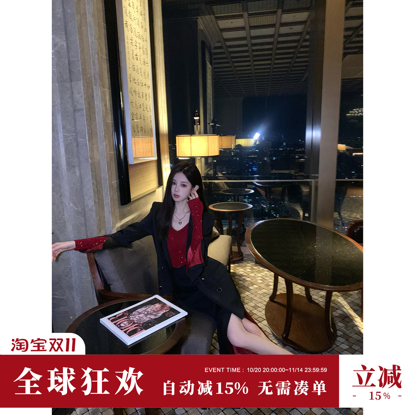 Sun雅乔【权利反转】宽松中长款黑色西装+修身包臀开叉半身长裙