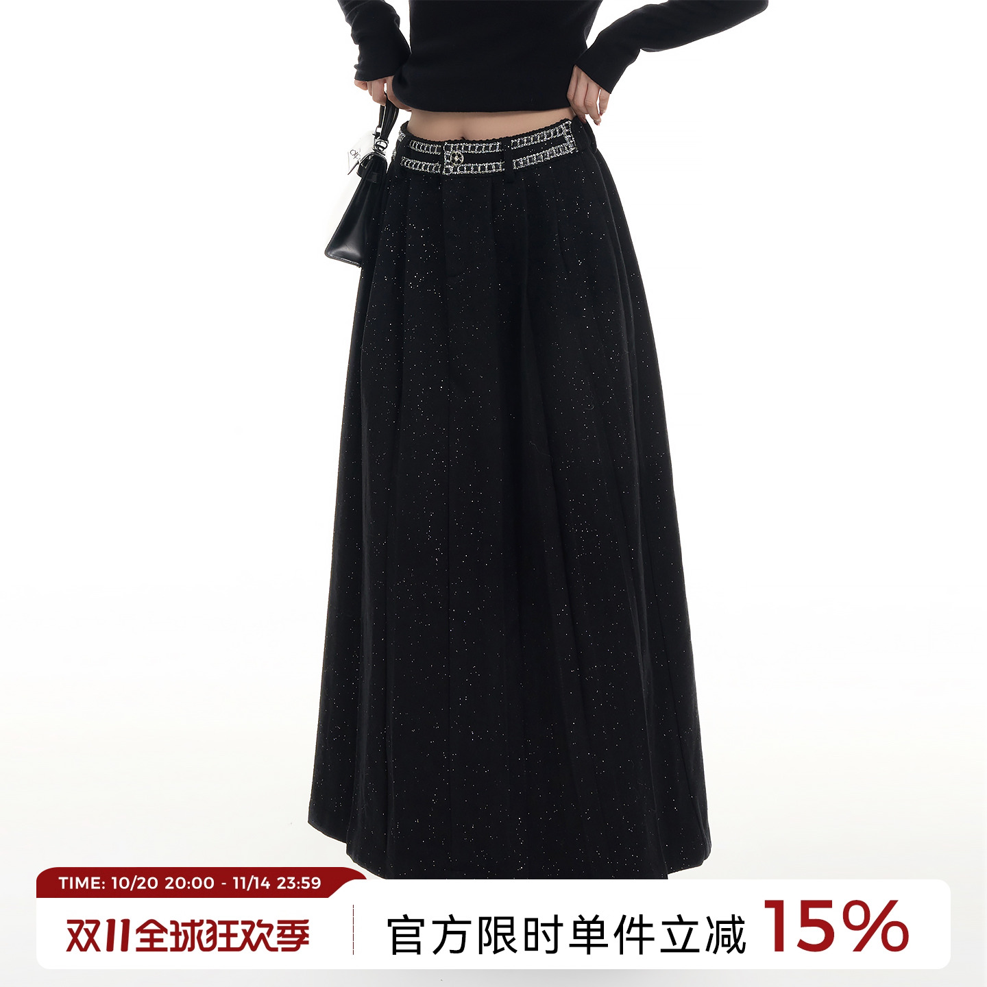 吴童童黑色亮闪闪高腰半身裙女秋季新款韩系气质宽松显瘦A字长裙