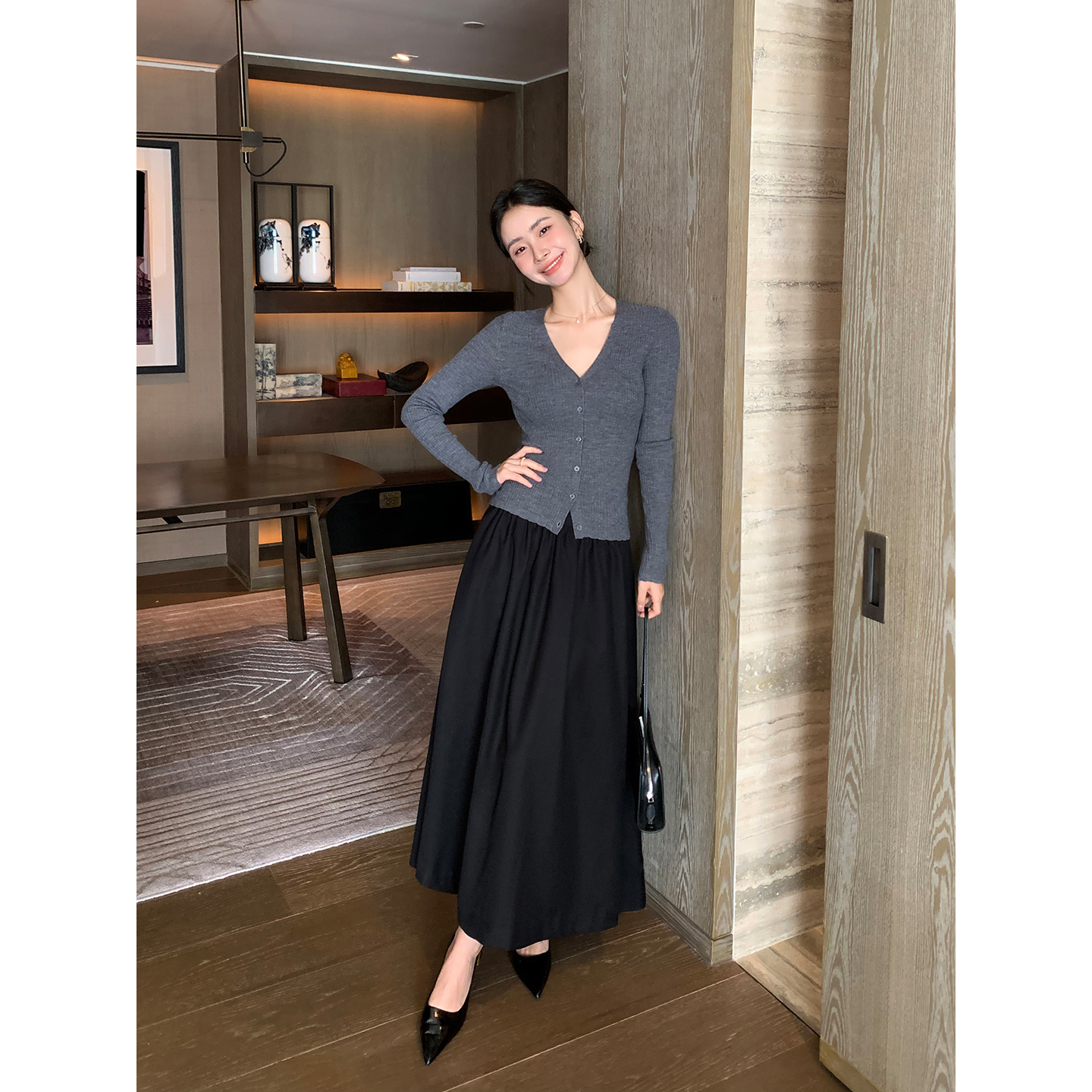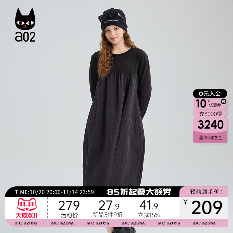 a02宽松假两件连衣裙女2025秋季新款黑色长裙冷淡系清爽通勤穿搭
