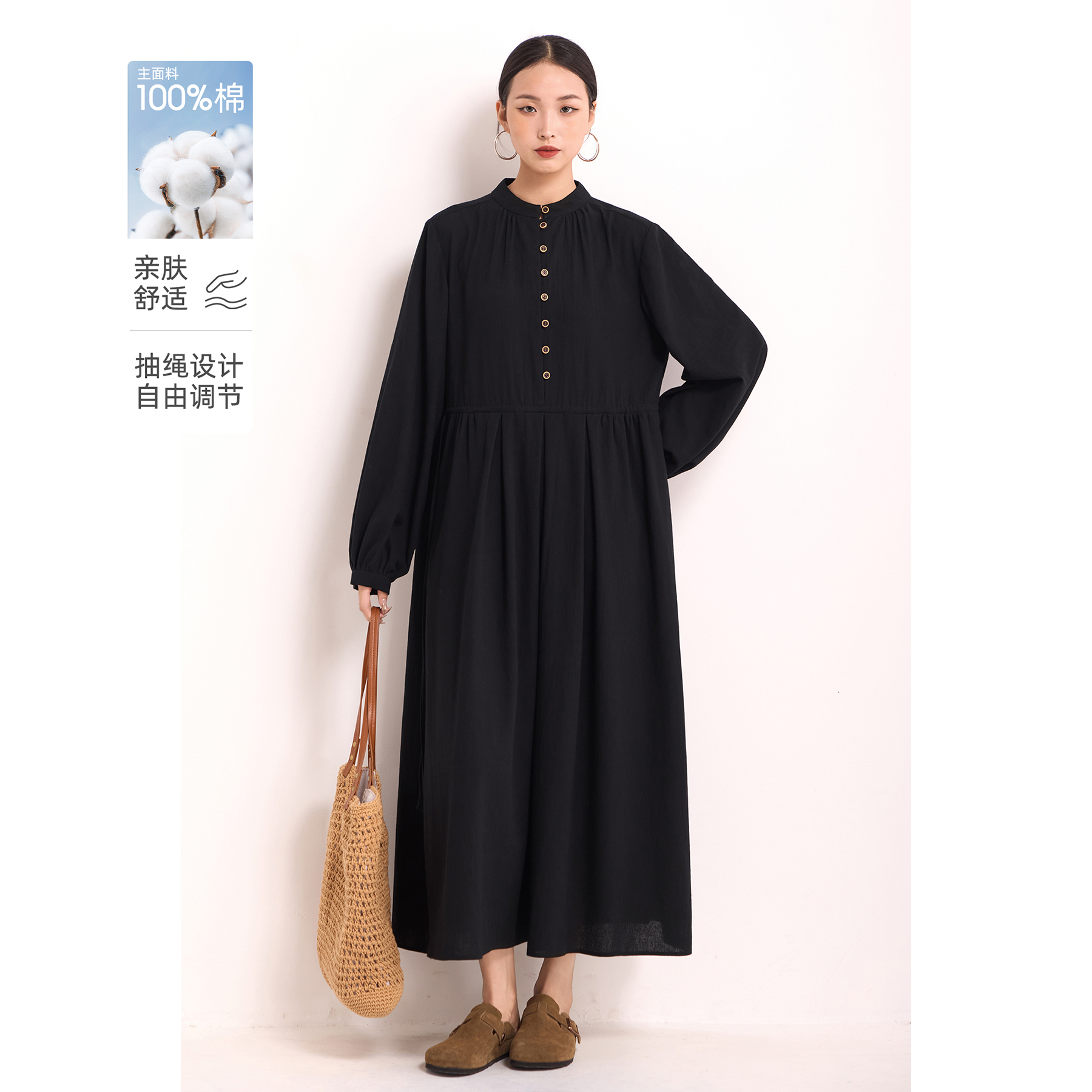连衣裙长袖长裙黑色立领抽绳收腰显瘦连身裙2025春秋宽松韩版女装