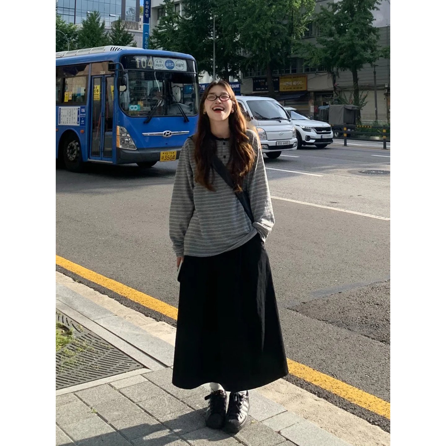 自制日系工装风黑色中长裙女秋学院风宽松纯色简约高腰a字半身裙