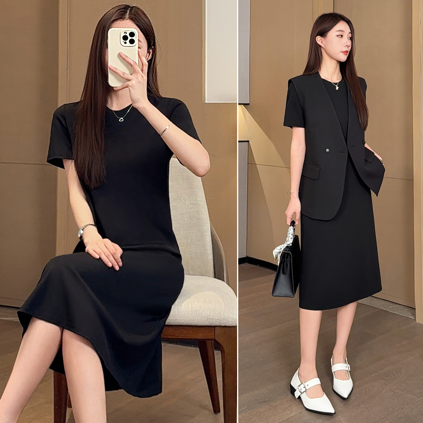 早秋季连衣裙女夏2025新款宽松气质直筒中长裙打底黑色短袖T恤裙
