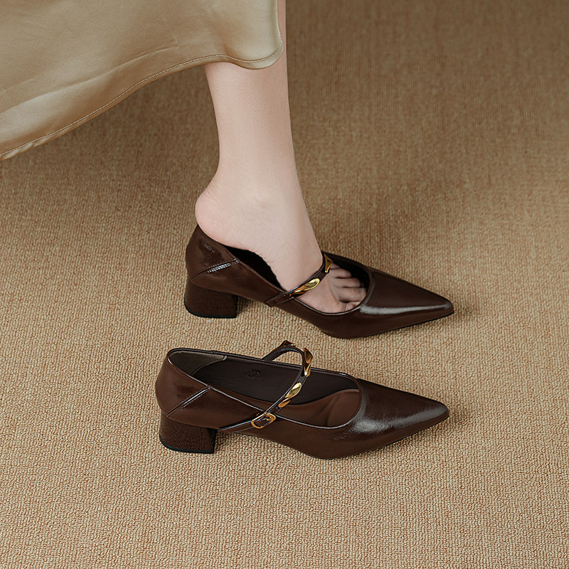 - 真皮粗跟尖头浅口单鞋