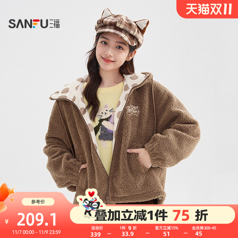 三福厚外套2025新款冬季少女毛绒星星图案连帽宽松上衣女装848738