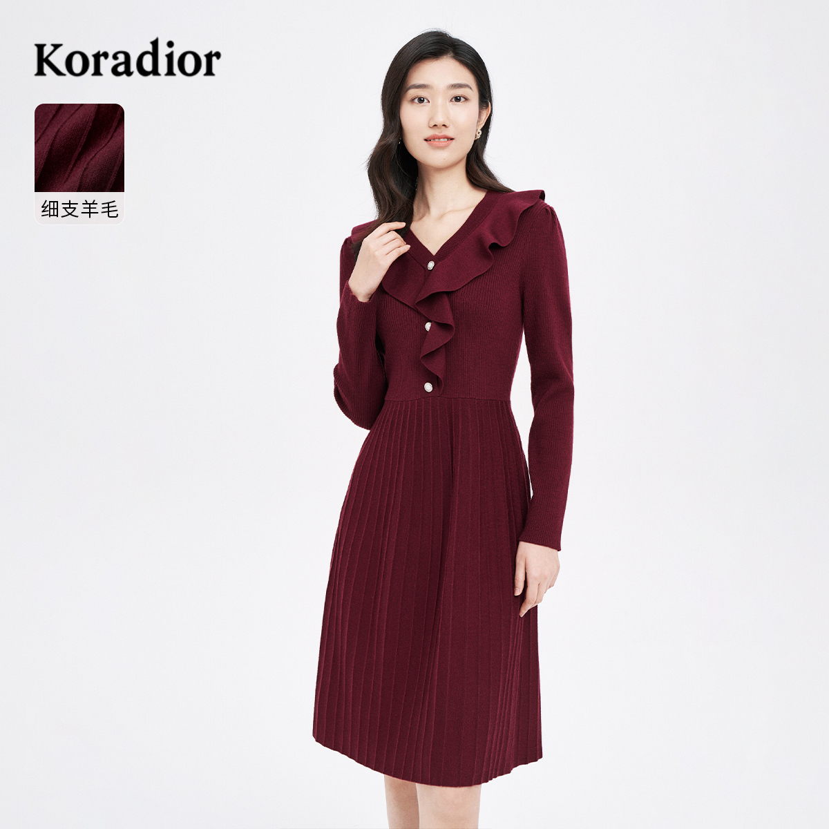 法式气质荷叶边针织连衣裙女2024冬季新款V领内搭红色宽松毛衣裙