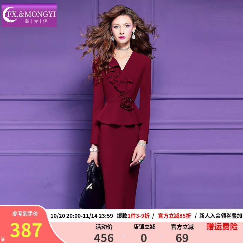 菲梦伊荷叶边红色西装连衣裙女冬季商务正装气质假两件职业包臀裙