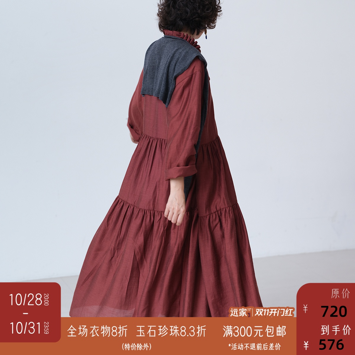 远家 荷叶边领系绳连衣裙 优雅复古休闲红色长裙子 秋新LF5813