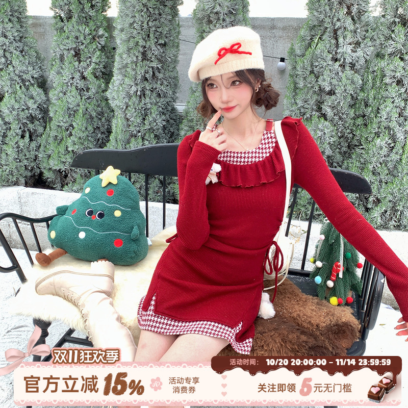 红色荷叶边v领毛衣连衣裙女秋冬2024新款法式气质别致打底针织裙