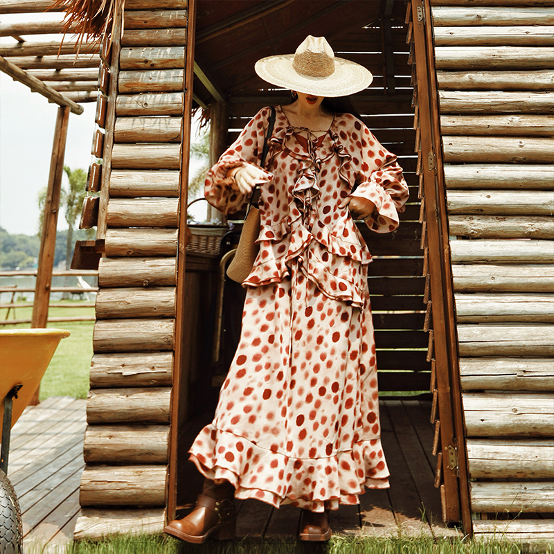 麦叙原创《浆果森林》浪漫复古红色波点印花荷叶边长袖宽松连衣裙