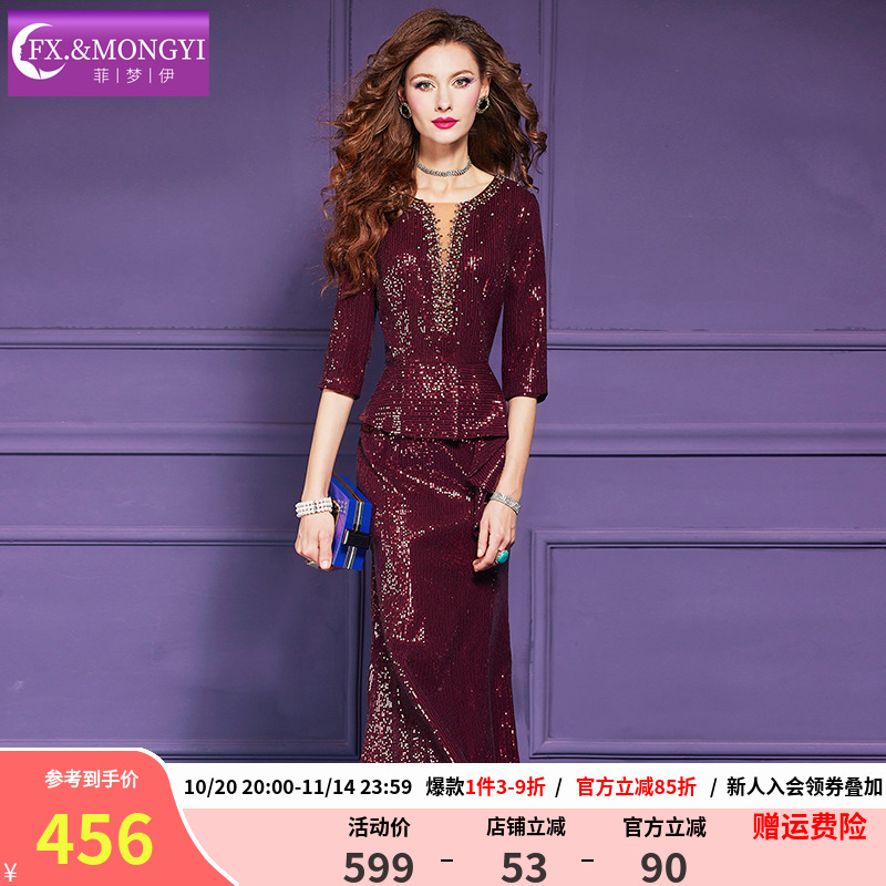 菲梦伊钉珠绣花红色连衣裙女秋装高贵轻熟荷叶边气质露肩礼服长裙