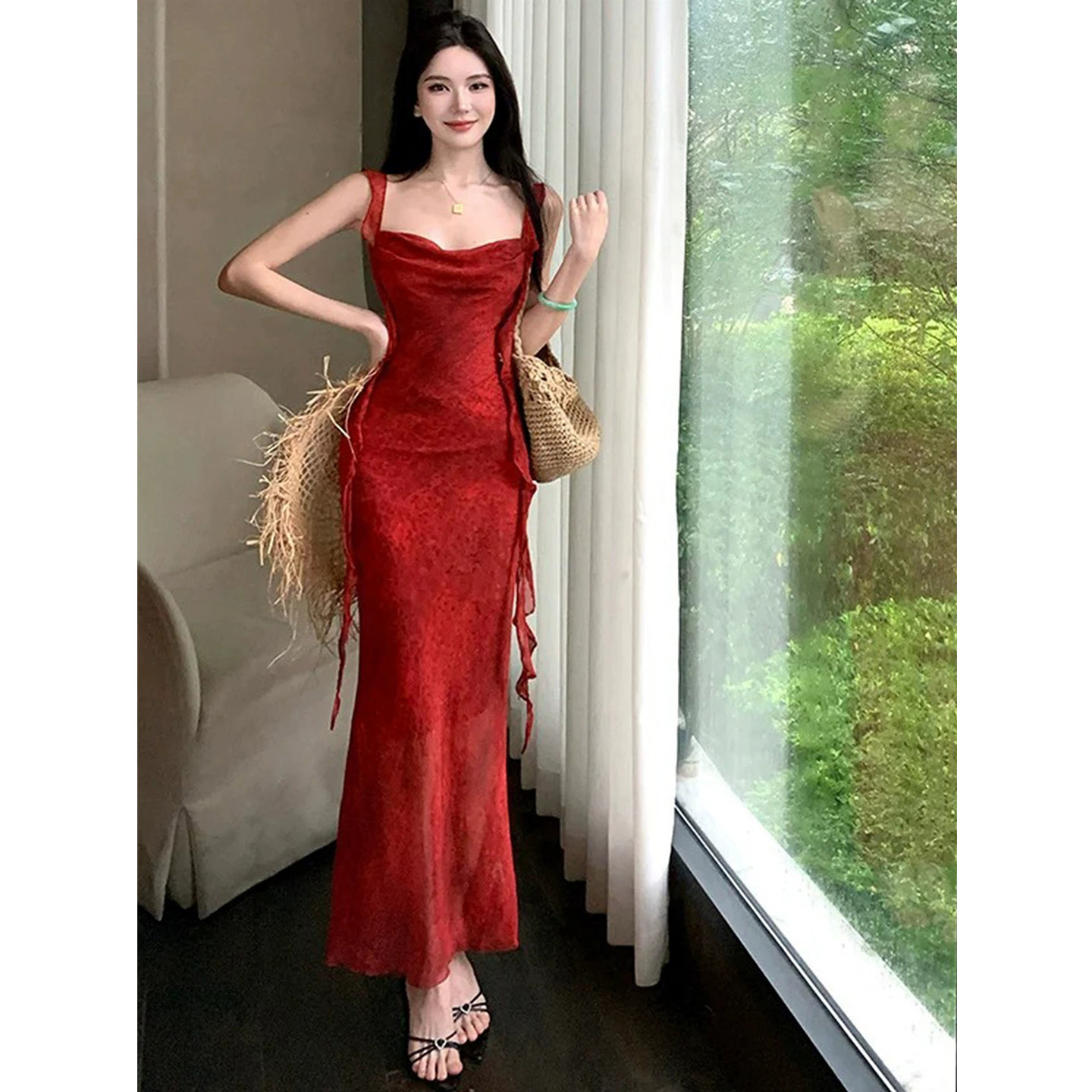 AZure轻法式复古红色连衣裙可露肩长裙荷叶卷边重工吊带裙开衩裙