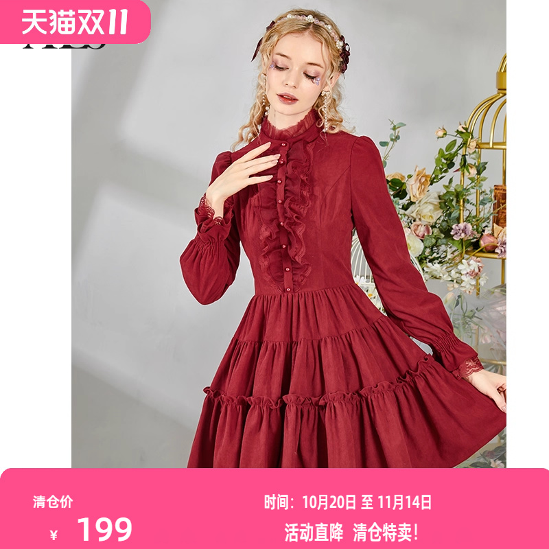 艾丽丝2025秋季新款红色灯芯绒短款连衣裙女显瘦荷叶边甜美蛋糕裙