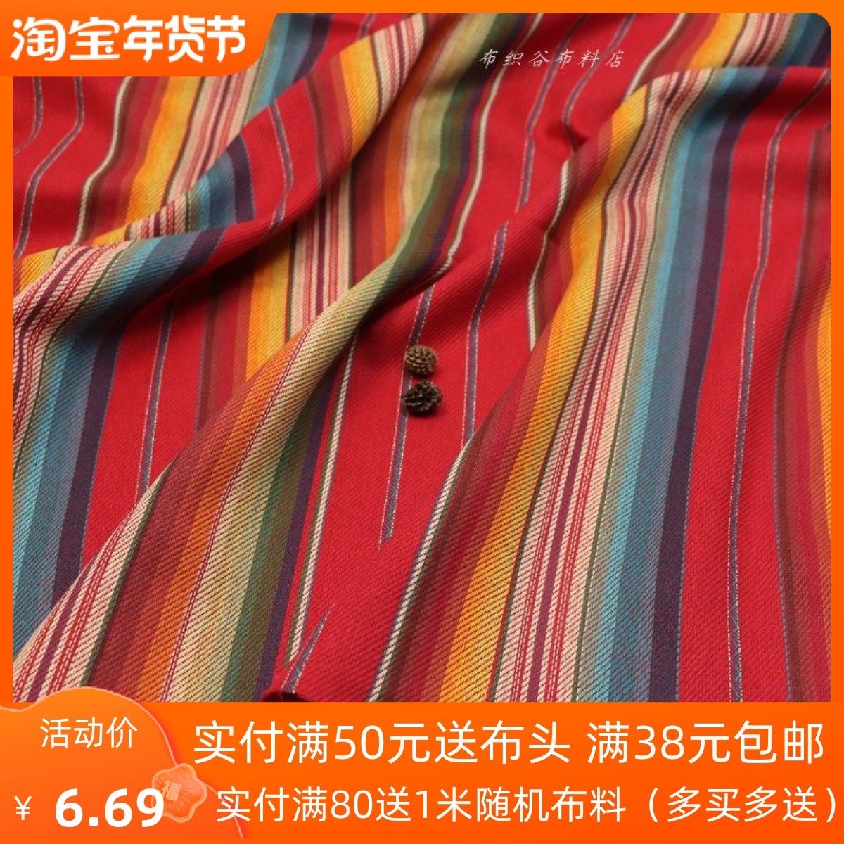 日单复古红黄绿蓝彩色条纹棉麻布料民族风连衣裙衬衫窗帘服装面料