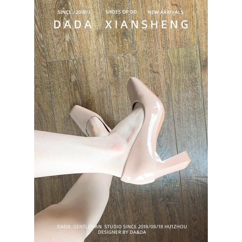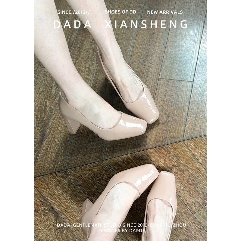 羊皮版~裸粉色单鞋女2026新款春季方扣漆皮百搭粗跟通勤高跟女鞋