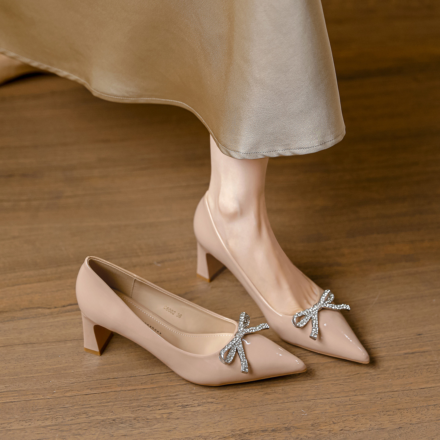 羊皮版~法式裸粉色蝴蝶结浅口尖头粗跟高跟鞋女春秋款单鞋配裙子