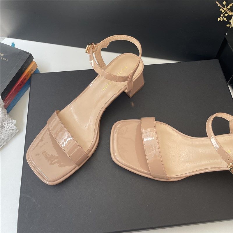 2025夏季新款一字带细跟高跟包头裸粉色漆皮大码V扣百搭女式凉鞋L