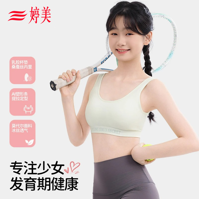 婷美【莫代尔蚕丝乳胶五角杯】少女发育内衣X型提拉舒适运动文胸