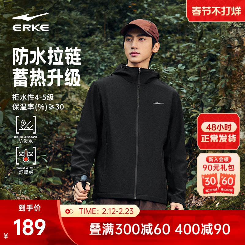 鸿星尔克加绒外套男冬季新款男士运动防风软壳冲锋青少年风衣夹克
